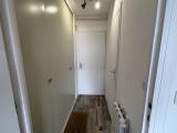 Une salle de bains avec WC et un hall d’entrée avec un grand placard.